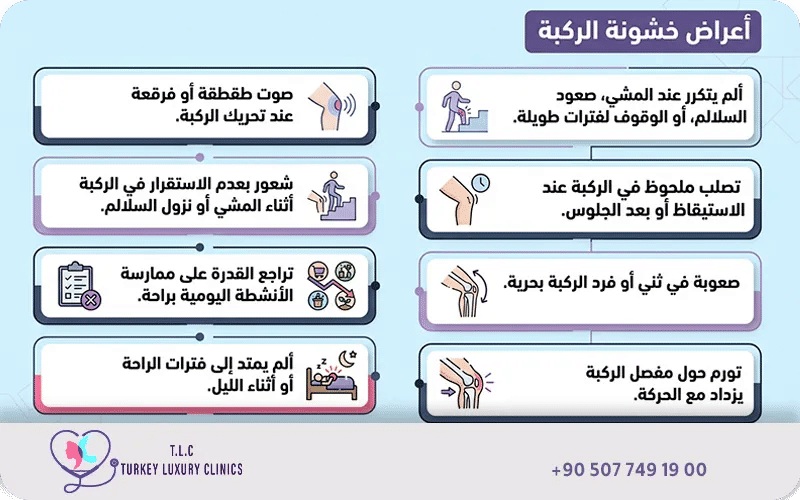 وفي اللحظة التي دخل فيها هذا الألم على حركتي وراحتي ونومي، أدركت أن علاج خشونة الركبة لم يعد خياراً مؤجلاً، وأنّ حالتي تحتاج إلى متابعة جادّة. أما أبرز الأعراض التي ظهرت لدي: