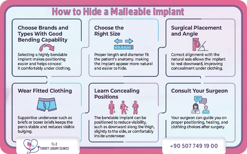 - Since malleable implants are bendable, the penis can be manually positioned in ways that minimize visibility: