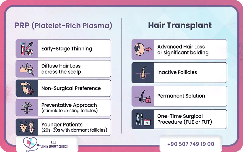 PRP is best for individuals with early-stage thinning or, aiming to strengthen existing, miniaturized hair follicles without surgery. Conversely, hair transplants are designed for individuals with advanced, stable, or patterned hair loss, who have sufficient donor hair for reconstructing bald areas.