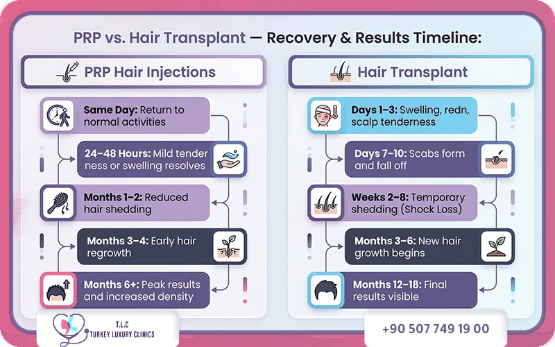 Hair transplantation involves a more significant surgical recovery process compared with PRP. Hair growth occurs gradually and is usually preceded by a phase of temporary hair shedding. Once the transplanted follicles grow, however, the results are permanent.
